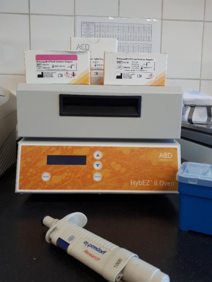 RNAscope technology is a revolutionary in situ hybridization method for the intracellular detection of specific RNA molecules. It is characterized by extreme specificity and sensitivity due to its special probe design. The lower portion of the Z-shaped probes is specific for the target sequence, which is linked to the upper tail sequence by a linker. Two closely spaced Z probes together form a sequence part to which a fluorescent dye is attached via a signal multiplication system. The outstanding specificity is given by the fact that only two side-by-side hybridizing probes can give a fluorescent signal. The method works on both fresh-frozen, fixed-frozen, and paraffin-embedded samples. It is possible to use up to 12 probes simultaneously, so that the expression of 12 genes can be detected in single section at a given moment. This method is excellent for validating and supplementing other quantitative methods. In our laboratory, we use the ACDBio RNAscope system.