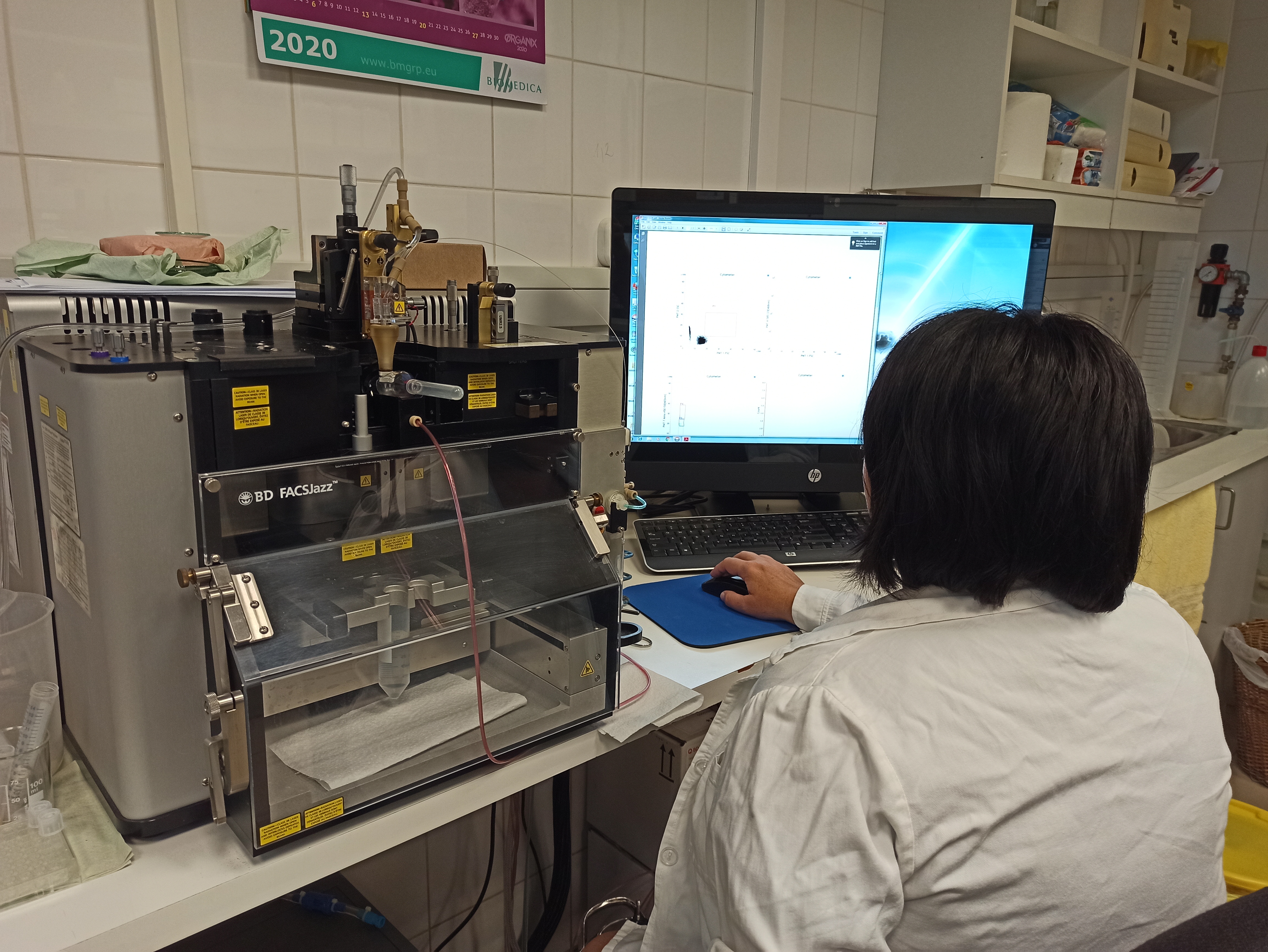 3. Beckton Dickinson Jazz fluorescent flow cytometer cell sorter equipped with 2 lasers (405 nm, 488 nm). Two-way single cell sorting is possible.