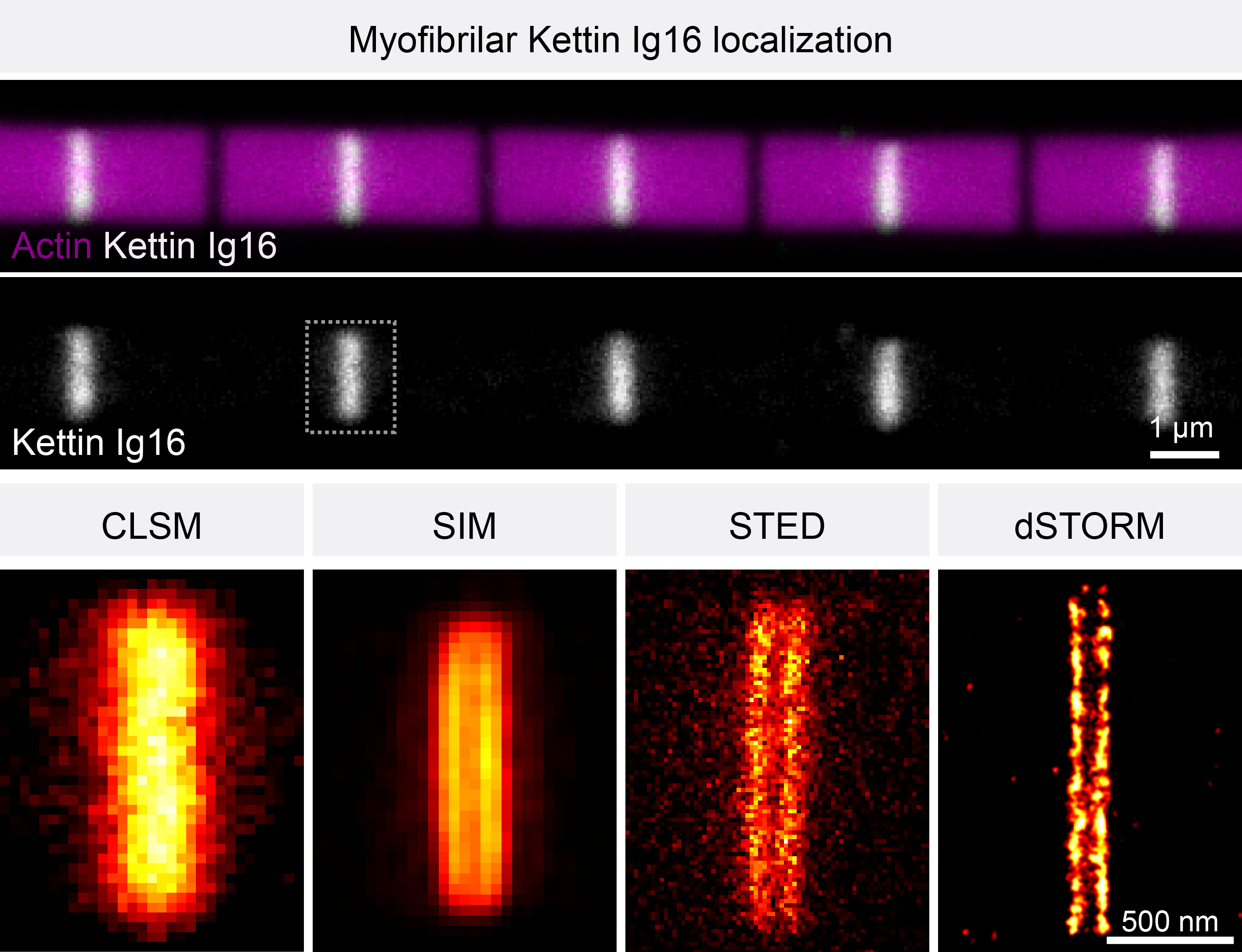 Comparison of the major superresolution microscopy methods reveals that the Z-disc protein Kettin appears as a single blurry band on confocal (CLSM) images, which is however, clearly resolved into two bands with SIM, STED and STORM.