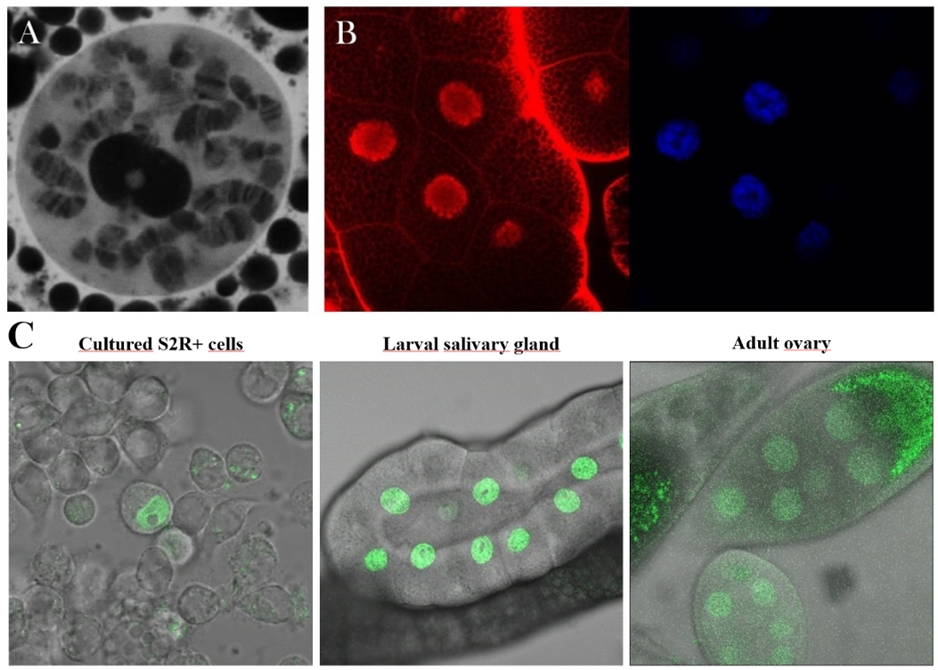 A) The distribution pattern of Moesin (white) in a polytenic, interphase nucleus.