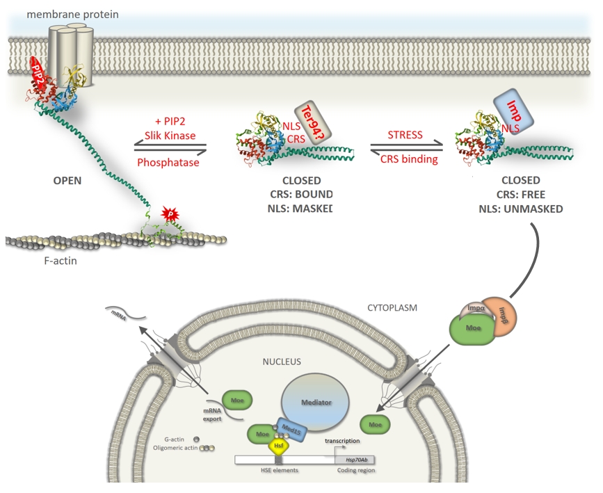 By studying the single ERM representative in Drosophila, Moesin, we demonstrated that ERM proteins are also present in the nucleus. We identified the protein motifs and mechanisms regulating the nuclear localization of Moesin, and examined the dynamics and regulation of its nuclear import. We also discovered that, in cooperation with the Mediator complex, Moesin participates in the regulation of heat-shock gene expression as well as in mRNA export.