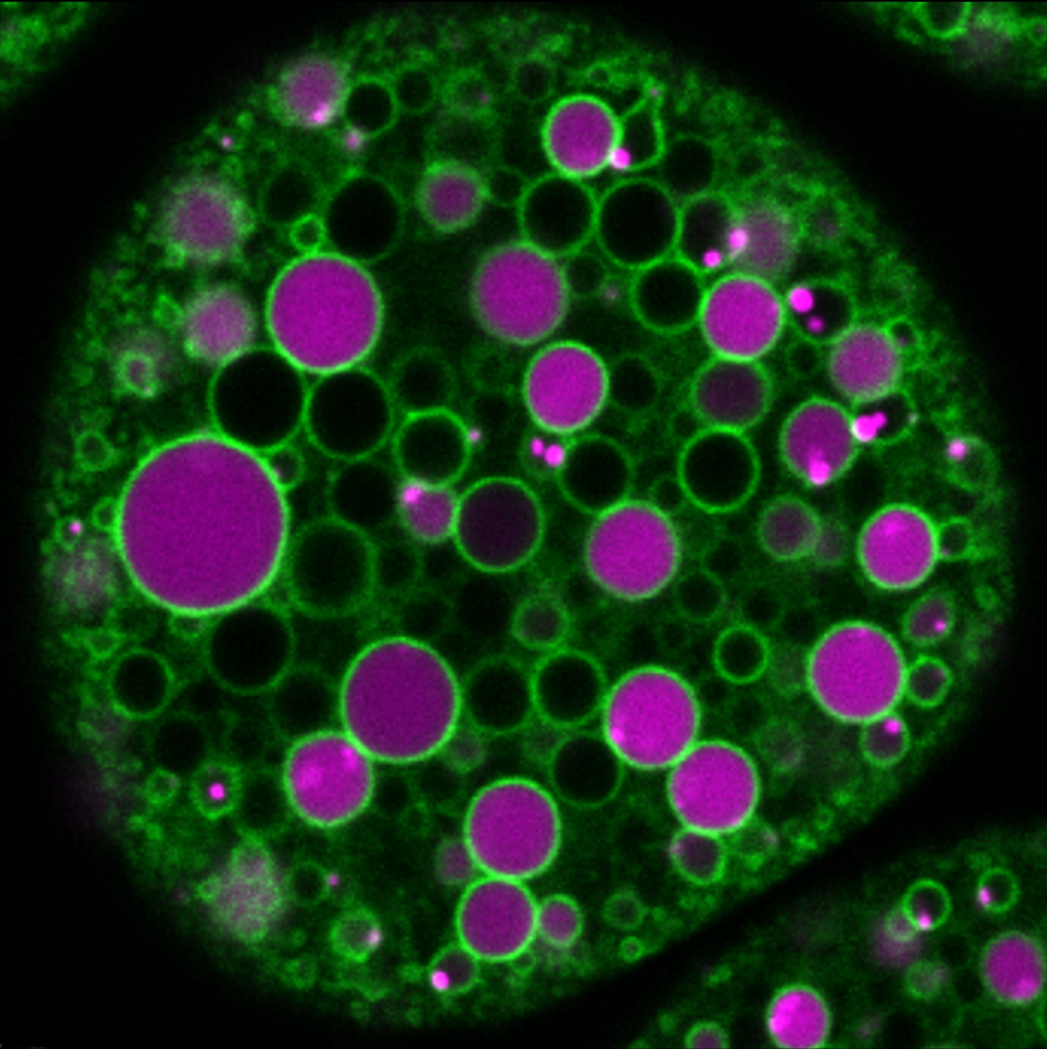 Figure 3. Confocal microscopic image of an ex vivo cultured living nephrocyte containing a fluorescently labelled endocytic tracer (magenta) and a fluorescently tagged endosomal protein (green). The tracer is transported to spherical endosomes after it was taken up by the cell via endocytosis from the culture media. Green „rings” represent endocytic vesicles with the tagged protein recruited to the outer leaflet of their limiting membrane. Experimental setups like this enable the investigation of endocytic trafficking through the simultaneous visualization of the endocytic cargo and regulator proteins of the endosomal maturation process.