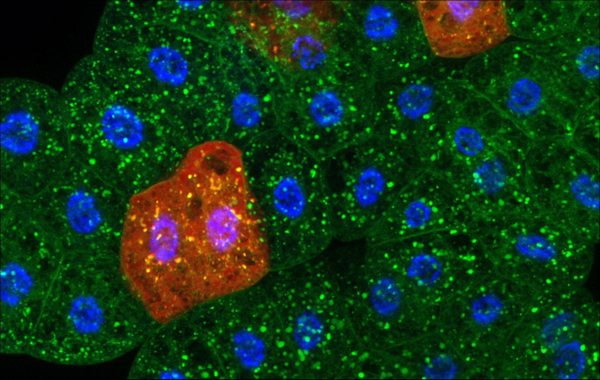 Figure 2. Starvation-induced ER-phagy assay using a mosaic genetic approach in the fat body of Drosophila. This organ is functionally analogous to the mammalian liver and fat and it exhibits robust autophagy in response to starvation stress. Therefore, multiple forms of autophagy can be effectively monitored in this tissue, including ER-phagy, which mediates the selective degradation of the endoplasmic reticulum (ER). In the image, Sec61-GFP (green) labels the ER, while cells shown in red indicate clones in which one of the ER-phagy receptor genes has been silenced.
