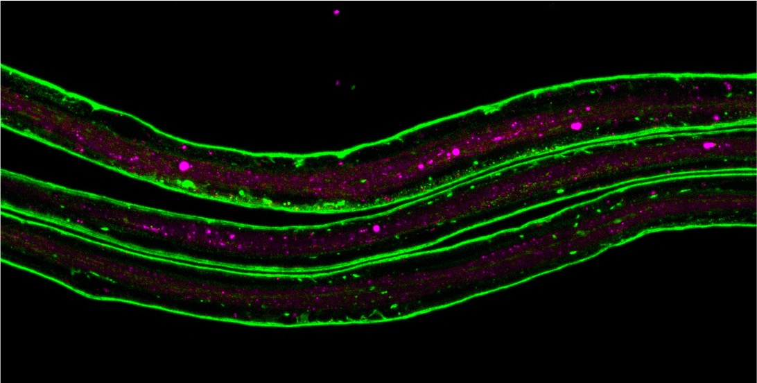 Figure 4. The image shows larval abdominal nerves, where the extracellular matrix protein Laminin B1 is labeled in green, and glial lysosomes are labeled in magenta. We use this system to uncover how glia cells reshape their ECM environment during normal development and following injury by clearing excess matrix material. Aided by the powerful genetic tools available in Drosophila, we constructed screening systems to identify key factors in matrix uptake, which we can further investigate to understand the mechanisms underlying phagocyte-mediated engulfment of ECM fragments.